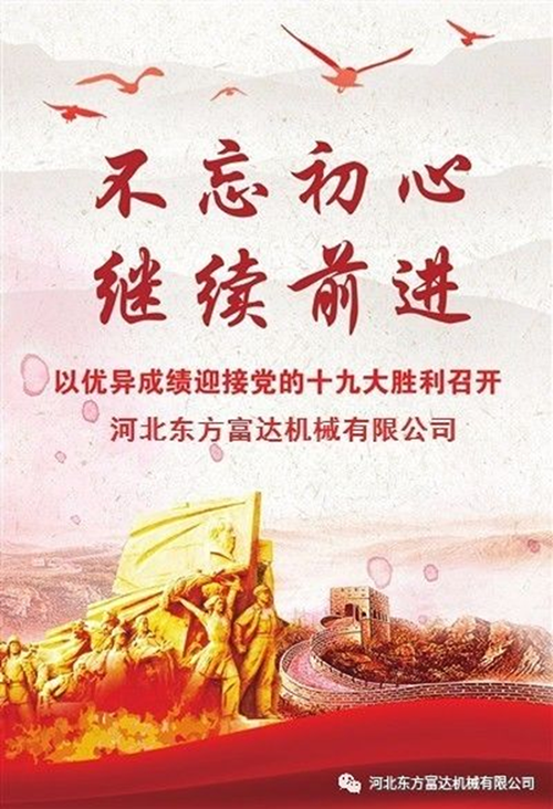 河北东方富达机械有限公司党委号召全体党员和干部员工要以饱满的精神状态和出色的工作业绩,全力做好迎接党的十九大和学习、贯彻党的十九大精神的各项工作。各党支部要继续配合行政,安排好生产经营各项工作,要求党员在各项工作中冲锋在前、勇挑重担,充分发挥好示范引领作用,保证安全生产,加强员工培训,努力兑现订单,以优异成绩向党的十九大胜利召开献礼。